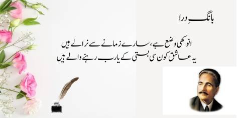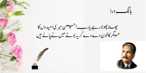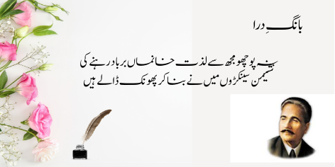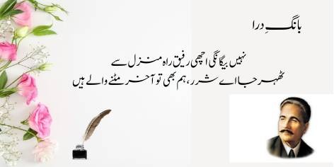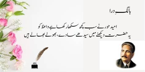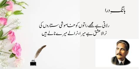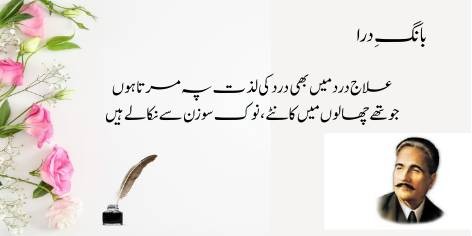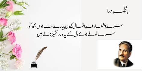 Ai Iqbāl! Mujhe apne ash’ār pyāre kyūñ na hōñ? Kyūnkeh yeh merī shā’irī nahīn, balkeh yeh mere ṭūṭe hue dil kī dard bharī faryādēñ aur āh-o-zāriyāñ hain. Ya’nī merī shā’irī sirf fan nahīn balkeh mere ḥaqīqī ġham kā izhār hai.