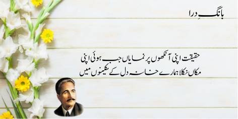 Jab merī apnī zāt kī sacchā’ī (ḥaqīqat apnī) merī apnī āñkhōñ ke sāmane ẓāhir hō ga’ī. Toh ma‘lūm huā ke yeh ‘ishq kā ḥaqīqī ṭhikāna (makāñ) bhī hamāre hī dil ke ghar (khāna-e-dil) ke andar basne wālōñ mein pāyā jātā hai. Yeh she’r pehle she’r kī ta’yīd hai ke khārijī duniyā kī bajāye bāṭinī duniyā hī aṣl ṭhikānā hai.