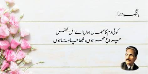 Ai duniyāwī mehfil ke bāsiyō aur sāthiyō! Maiñ ṣirf chand lamḥōñ kā mehmān hūñ; ya‘nī merī zindagī bahut muḳhtaṣar reh ga’ī hai. Merī miṡāl ṣubḥ ke waqt jalne wāle charāġh kī sī hai jo Sūraj nikalne par bujhne ke qarīb hōtā hai. Shā‘ir yahāñ ek rūḥānī thakan aur fanā kī ārzū kā izhār kar rahā hai, ke is duniyā se kōch karne kā waqt qarīb hai.