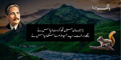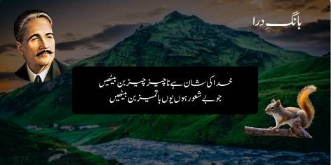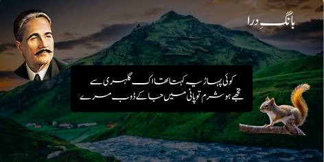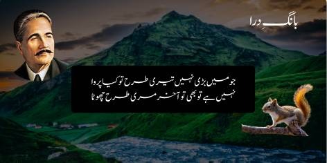 علامہ اقبال کی مشہور نظم “ایک پہاڑ اور گلہری” کا یہ ابتدائی حصہ ہے، جس میں پہاڑ اپنے حجم اور عظمت کے نشے میں گلہری کی چھوٹی سی ہستی کا مذاق اڑاتا ہے۔ پہاڑ نے نہایت حقارت آمیز اور تلخ لہجے میں گلہری کو مخاطب کیا اور اپنی بڑائی کا اظہار کیا: