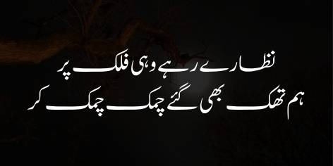 Yahāñ sitāre chānd se apnā iztirāb aur be-samar mehnat (agitation and fruitless effort) kā gilah karte hain. Woh pūchhte hain ke Ay chānd, yeh to batā ke ham jo chamak chamak kar thak chuke hain, is ke bāwajood āsmān ke nazāroñ mein koī tabdīlī nahīn ā’ī (tell us, despite shining repeatedly until we are tired, no change has come to the scenes of the sky).