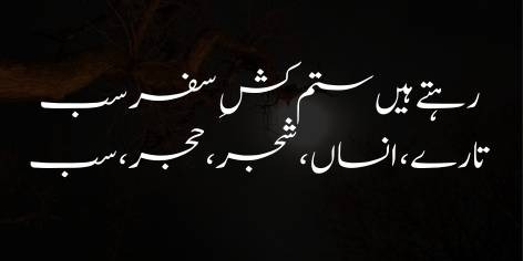 Is sher mein sitāre (chānd se) kā’ināt kī ‘umūmī hālat (general state of the universe) kā shikwah karte hain, jahāñ har shai harkat aur safar mein mubtalā hai (everything is engaged in movement and journey). Woh kehte hain ke yahāñ to har jānib sab log safar mein mubtalā rehte hain. Hamārī (sitāroñ kī) bāt to alag rahī (leave our case aside), lekin yahāñ yeh insān, darakht aur patthar sab hī safar kī su’ūbatain (hardships of journey) bardāsht karte rehte hain.