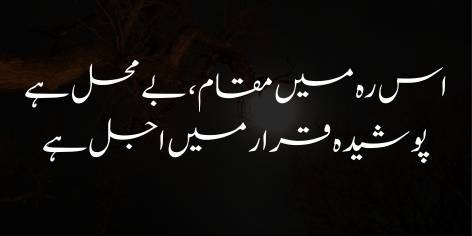 Is sher mein chānd musalsal jad-o-jehad aur harkat kī ahmiyat (importance of continuous struggle and movement) par zor dete hue sukoon aur ṭhehrā’o ko maut se tashbīh (likens rest and stability to death) detā hai. Woh kehtā hai ke chunānche, manzil tak pohnchne ke liye jo masāfat muqarrar hai (the distance set to reach the destination), us mein ṭhehrane kā amal be-mauqa’ aur qat’ī nāmunaāsib hai (the act of stopping is ill-timed and absolutely inappropriate).