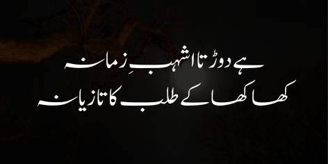 Is sher mein shā’ir zamāne yā waqt kī harkat (movement of time) kī asal tāqat (muharrik) (the real driving force) ko bayān karte hain. Shā’ir kehte hain ke agar is zamāne ko ghoṛe se tashbīh dī jāye (if this age is likened to a horse), to yūñ samjho ke woh ghoṛā khwāhish ke chābuk khā khā kar dauṛtā hai (that horse runs by receiving the whips of desire).