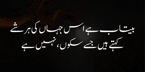 Woh mazeed pūchhte hain ke in ke iztirāb (agitation) mein kamī kyūñ nahīn ātī jise sukoon (peace) kahā jātā hai, kyūnke yahāñ is ko (peace) ānkheñ tarastī hain (eyes yearn for it). Dar-asal, shā’ir yeh pūchh rahe hain ke musalsal jad-o-jehad aur tabdīlī (continuous struggle and change) ke is ‘ālam mein koī bhī cheez pā’edār rāhat aur ṭhehrā’o (lasting comfort and stability) kyūñ nahīn pā saktī, aur har zī rūh sukoon kā mutalāshī kyūñ hai.
