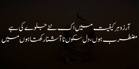 Is sher mein shā’ir apnī dā’imī be-chainī kā sabab aur maqsad (the cause and purpose of his perpetual restlessness) bayān karte hain. Woh farmāte hain ke merī har kaifiyat mein ek naye jalwe kī ārzū poshīdah hai (in every state of mine, the longing for a new manifestation or sight is hidden).