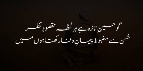Ya’nī, the poet’s eye looks towards new beauties, but his rūhānī yā takhleeqī wafā (spiritual or creative loyalty) remains uṭūṭ (unbreakable) with his a’lā usooloñ (higher principles) or the Haqīqī Ishq (True Love). This sermon shows the contradictory yet balanced relationship between the search for freshness and steadfastness to fundamental principles.
