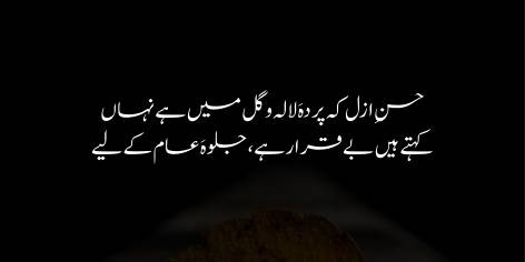 Woh kehte hain ke Husn-e-Azal (the beauty that exists since eternity and is the reality behind the universe) jo lālah-o-gul aur dūsre mazāhir-e-fitrat mein poshīdah hain (which is manifested in flowers and other scenes of nature), sunā hai ke apnā jalwah dikhāne ke liye muztarib hain (are restless and anxious to reveal themselves completely).