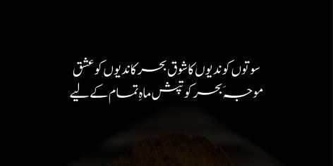Conversely, samundar kī maujeñ chaudhavīn rāt ke chānd kī muntazir rehtī hain (the waves of the sea await the moon of the fourteenth night). This contradiction shows that while smaller things (springs, rivers) are searching for qurbat aur fanā (closeness and annihilation), the samundar (sea, a symbol of vastness) awaits the nazārah aur kamāl (sight and perfection) of some husn-e-kāmil (perfect beauty, the full moon) so that its vastness may also be adorned with a superior beauty.