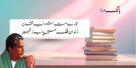 Asmān ke qaid khāne (zindān-e-falak) mein qaid sitāre bhī apnī qismat (taqdīr) kī sharāb pī kar mast hain aur unhēñ bhī zanjīrōñ se jakṛā huā hai. (Yahāñ murād yeh hai ke har chīz qānūn-e-fiṭrat kī pāband hai.