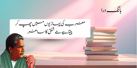 Aur wahī Sūraj shām kō maġhrib kī pahāṛiyōñ mein chhup kar ġhurūb hō jātā hai, gōyā wōh surḳh shafaq kī sharāb kā piyāla pī rahā hai. (Yahāñ bhī Sūraj kō ‘amal aur sukūn dōnōñ ḥālatōñ mein dikhāyā gayā hai. Kā’ināt kī har shai apne wujūd se lutf uṭhā rahī hai (lazzat gīr-e-wujūd) aur har chīz apne ẓāhir hone kī khushī aur surūr (mai-e-namood) mein mast hai.