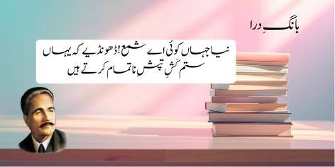 (علامہ اقبال، ناتمام عشق پر افسوس کرتے ہیں) اے شمع (اُمید)! کوئی نئی دنیا یا نیا راستہ تلاش کیجیے، کیونکہ اِس دنیا میں لوگ نامکمل اور ادھورے عشق و تڑپ (تپشِ ناتمام) کے ظلم اور تکلیفیں اٹھا رہے ہیں۔ (یعنی جہاں کا حسن مکمل نہیں اور عشق بھی اطمینان بخش نہیں۔)