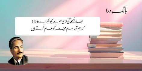 (علامہ اقبال، واعظ (مبلغ) سے اختلاف کرتے ہیں) اے واعظ! آپ کا اور ہمارا ساتھ آخر کیسے نبھ سکتا ہے؟ کیونکہ ہم تو عشق اور محبت کے طریقے کو ہر جگہ پھیلا رہے ہیں (عام کرتے ہیں)، جب کہ تم صرف خشکی اور زاہدانہ تعلیمات پر زور دیتے ہو۔