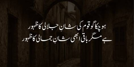 Harchand ke hamāri shaan-o-shaukat aur hukmarānī ka daur (māzī mein) guzar chukā hai, iss ke bāwajood ab bhi hamāre andar muhabbat aur kirdār ke husn (khoobsūrati aur umdagi) ka zahoor bāqi hai. (Ya’ni zāhiri tāqat khatm ho ga’ī hai magar akhlāqi aur rūhāni qadrēñ bāqi hain.)