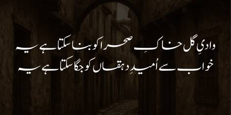 Hum ab bhi yeh ahliyat aur tāqat rakhte hain ke dasht-o-sehrā (veerān jungalōn aur registānōn) ko Wādi-e-Gul (phoolōn ki tar-o-tāza wādi) mein tabdeel kar dēñ, aur (apne amal-o-jadd-o-jehad se) so’e hue (ghaflat mein paṛe) kisānōn ko bedār kar sakte hain.
