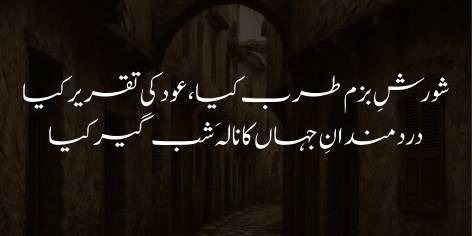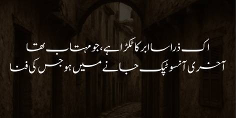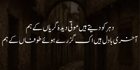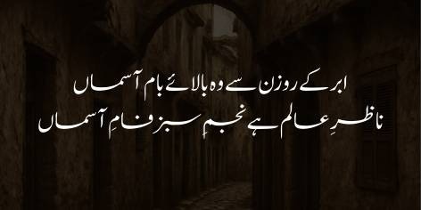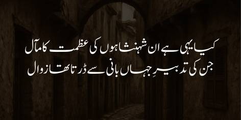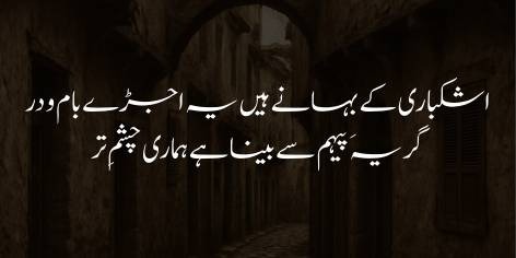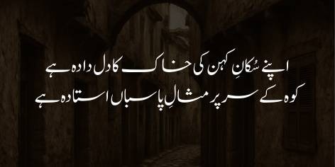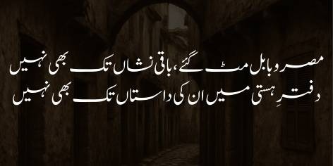 Yeh barbād shudah bām-o-dar (imārāt aur makānāt) dar-haqeeqat hamāre liye āñsoo bahāne (ashkbāri) ke bahāne bane hue hain. Aur inhi ki musalsal yaad ke wasīle se hum abhi tak apni sābiqah dānish o hikmat (aql-o-fehm aur ilm) se istefādah kar rahe hain.
