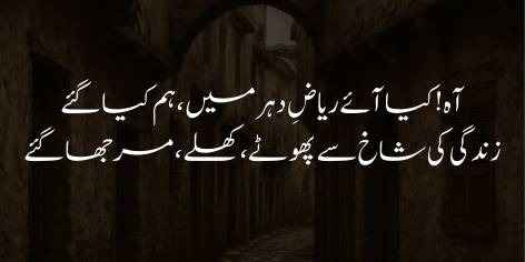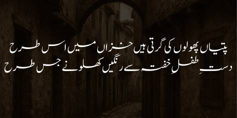 Mausam-e-Khizāñ ke daurān, shagufta (khule hue) phoolōn ki pattiyāñ iss andāz se uṛ uṛ kar zameen par girtī hain, jaise kisi so’e hue bacche ke hāth se be-khayāli mein khilōne neeche gir jā’ēñ.