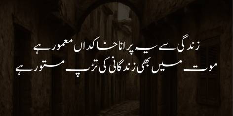 Amali sat’h par dekhā jā’e to yeh itni qadeem dunyā qarn-hā-qarn (saddiyōn) guzar jāne ke bāwajood āj bhi zindagi ki raunaqōn se ma’moor hai. Hadd to yeh hai ke woh log jo bohat pehle fanā ke ghāṭ utar chuke hain, unki maut mein bhi kahīn na kahīn zindagi ki ek taṛap posheeda mehsoos hoti hai.