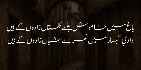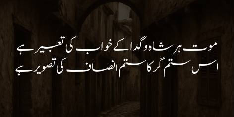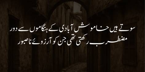 Woh shaan-o-shaukat wāle hukmarān, jinhēñ unki tishna-e-takmeel (adhoori) ārzū’ēñ aur khwāhishāt apni zindagi mein hamesha be-chain aur muztarib rakhti thīñ, āj ābādi se kōsōn dūr iss veerāne mein mukammal khāmoshi ke sāth abdī (hamesha ki) neend so rahe hain. Yeh manzar dunyā ki āarzi haisiyat aur ārzū’ōn ke anjām ko zāhir karta hai.
