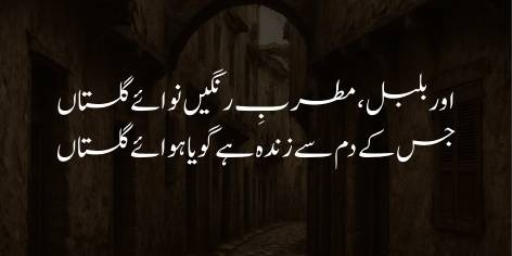 Issi tarah, bulbul bhi gulistān (bāgh) ki fizā ko apne khoobsūrat naghmōn se rangīn banā’e hue hai, jiss ki sureeli āwāz ke bā’is bāgh mein mausam-e-bahār ki āmad ka khoobsūrat ehsās hotā hai.