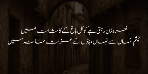 Bāgh mein apne ghōñslay ke qareeb kō’il naghma sarā’ī (geet) kar rahi hai, tāham woh ghane pattōn ke jhunḍ (jhurmaṭ) mein baiṭhī huī hai, jiss ki wajah se woh insān ki āñkh se ojhal (posheeda) hai.