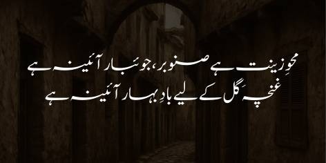 Sanobar ka darakht iss tarah apni ārā’ish (sajāwat) mein mashghūl hai ke nadī ka shaffāf pānī uss ke liye ā’īne (mirror) ka kām kar rahā hai. Bilkul issi tarah, ghunche (kali) ke liye bahār ki zindagi bakhsh aur khush-gawār hawā’ēñ ā’īne ka kirdār adā kar rahi hain (jo uss ke khilne ki naveed deti hain).