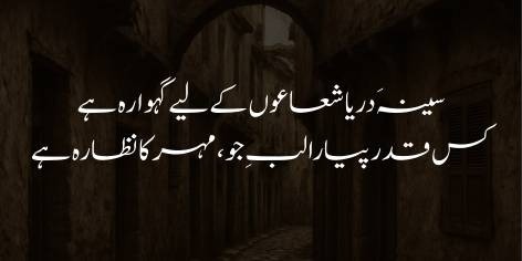 Sūraj ki shu’ā’ōn ke liye sat’h-e-dariyā ek gehwāre (jhūle) ki mānind lag rahi hai, aur isi dariyā ke kināre par tulū’-e-āftāb (sunrise) ka sārā manzar nihāyat haseen aur pyārā lag rahā hai.