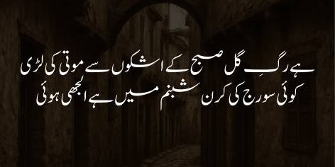 Iqbal iss shē’r mein farmāte hain ke subah ke waqt phoolōn par shabnam ke qatre iss khoobsūrat andāz mein paṛe hue hain ke woh mōtiyōn ki laṛi ki tarah dikhā’ī dete hain. (Husn ka ālam yeh hai ke) yūñ mehsoos hotā hai ke sūraj ki koi kiran shabnam ke kisi ek qatre mein ulajh kar qaid ho ga’ī ho.