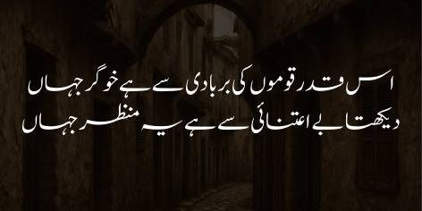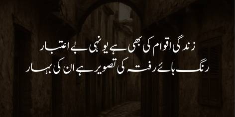 Yeh haqeeqat hai ke jumla (tamām) anāsir ki tarah aqwām-e-ālam ka wujood bhi kisi mustaqil i’tibār ka hāmil nahīn hai. Unka urooj sirf māzi ke hawāle se hi dekhā jā saktā hai, jiss se yehi murād hai ke har qaum ka muqaddar bil-ākhir zawāl se ibārat rahā hai, ya’ni urooj-o-zawāl ka yeh silsila aṭal hai.