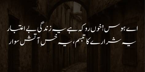 Woh shakhs jo iss dunyā mein zyādah arsay tak zinda rehne ki ārzū rakhtā hai, woh hamesha khoon ke āñsoo rotā hai, kyunke yeh zindagi bilā shubha intehā’i nā-qābil-e-i’tibār hai. Nā-pā’edāri ke lihāz se, iss zindagi ko chand lamhōn tak chamakne wāli chingāri aur āg ki lapēṭ mein ā kar fauran khatm ho jāne wāle tinkay se tashbīh dī jā sakti hai.