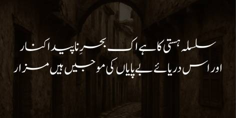 Iqbal iss shē’r mein insāni hayāt ko ek aisay lā-mehdood samandar se tashbīh dete hain jiss ka koi dūsrā kinārah nahīn hotā, lekin uss samandar ki mānind iss hayāt mein bhi be-shumār lehreñ aur madd-o-jazar (utār chaṛhā’o) āte hain, jinhēñ woh insāni maqbarōn (qabristānōn) se ta’beer karte hain.