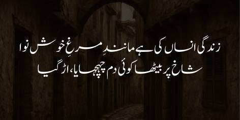 Issi tarah insān bhi ek khush-ilhān (sureelay) parinday ki mānind hai, jo mukhtasar waqt ke liye kisi shākh par baiṭhtā hai, kuch naghmay alāptā hai (zindagi guzārtā hai), aur phir apna waqt poora hone par uṛ jātā hai. Yeh insān ki zindagi ki āarzi haisiyat ko bayān karta hai.