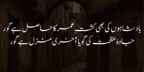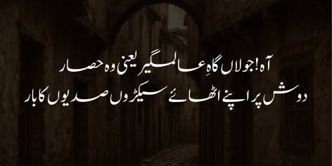 Woh hukmarān jinke chehre kabhi sūraj ki tarah roshan aur pur-shikoh the, ab qabr ke gehre andherōn se do-chār hain. Yeh wohi jaleel-ul-qadr (bā-azmat) farmānrawā the jinki shaan aisi thi ke khud āsmān bhi unke darwāzōn par sajda rez hotā nazar ātā thā (ya’ni jinki azmat āsmān ko chooti thi).