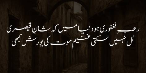 Iss liye iss haqeeqat ko tasleem karnā nā-guzīr hai ke khwāh Cheen jaisi azeem-ush-shān saltanatōn ke farmānrawā’ōn ka rau’b-o-dabdaba ho ya Room ke pur-haibat shehanshāhōn ki shaan-o-shaukat ho, maut ek aisā tāqatwar aur aṭal dushman hai jiss ka wār kabhi bhi ṭal nahīn saktā.
