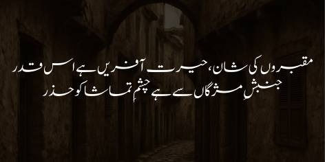 Chunānche yeh bāt yaqīnī hai ke iss goristān mein abadi neend sone wāle bahādur aur ulul-azm shehanshāhōn ko, na to unki guzri huī aish-o-ishrat ki mehfilōn ke hangāme jagā sakte hain aur na hi sāz-o-mūsiqi ki dilfareb sadā’ēñ unhēñ dobāra bedār kar sakti hain.