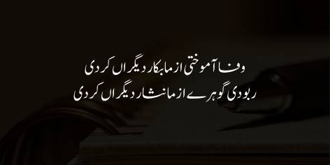 Wafā karne kā andāz (wafādārī kā salīqah) tū ne (hum Musalmānōn se) seekhā, lekin usay to dūsrōñ ke kām lāyā (ya’ni apnā īmān aur wafādāri ghairōn ke liye iste’māl kī). Goyā, tū ne hamārā ek qeemati mōti (jo wafā hai) uṛāyā aur usay dūsrōñ par nichhāwar kar diyā.