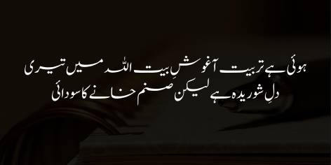 Harchand ke tumhāri (rūhāni aur mazhabi) tarbiyat Khuda ke ghar (Ka’aba) mein huī hai, iss ke bāwajood tumhāre dil (khuloos-e-Tauhīd ke bajā’e) but-khānōn (ghair islāmi rusūm, nazriyāt ya dunyāvi muhabbatōn) ke shaidayī aur giroeedah hain.
