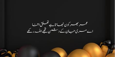 Birthday Dua Poetry humein yaad dilati hai ke sab se khoobsurat tohfa lafzon mein nahi, balkay dil se nikli dua mein hota hai. Har ashaar ek paighaam hai — mohabbat, shukriya aur umeed ka. Apne loved ones ko yeh shayari bhejein aur unke birthday ko khushi aur barkat se bhara hua banayein.