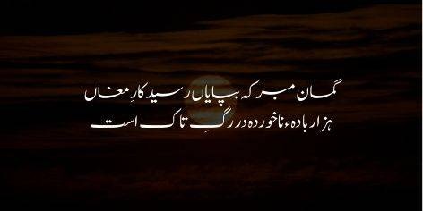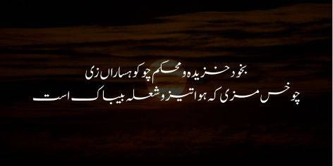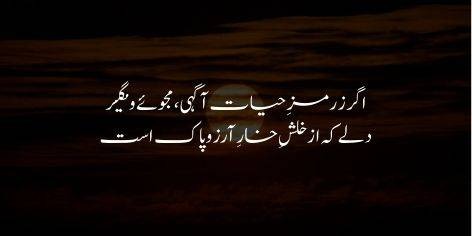 Agar tu zindagi ke bhed se waqif hai, to aisa dil na dhoond aur na hi qabool kar jo arzoo ke kaantay ki khattak se khali ho. Zindagi ka asal maqsad kisi aala nasb-ul-ain ki arzoo mein tadapna hai.