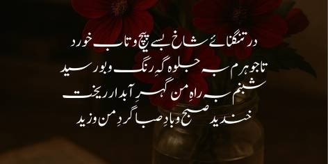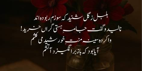 Jab bulbul ko maloom hua ke phool banne ke amal mein mera wo asli soz aur tarap kam ho gayi hai, to wo tarap uthi aur kehne lagi ke ay lale! Tu ne duniya mein zahir hone ke liye bohat mehangi qeemat chukayi hai (yani apni andarooni tarap kho di hai). Ab mein apna seena khole suraj ki tapish ka muntazir hoon aur us ka ehsan utha raha hoon ke shayad us ki shua’ein mere bujhay hue soz ko dobara bharka dein aur mujhe wahi azli tarap wapas mil jaye.