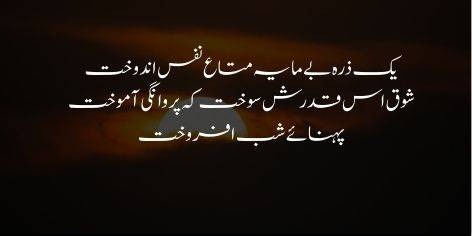 Ek nacheez zarre ne zindagi ki daulat ikathi ki (yani zinda ho gaya). Shauq ne usay is qadar jalaya ke wo parwana banna seekh gaya aur us ne raat ki wusat ko roshan kar diya.