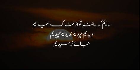 ہم انسان بھی تیری طرح مٹی سے پیدا ہوئے۔ ہم نے (جلوہ) دیکھا تب بھی تڑپے، نہ دیکھا تب بھی تڑپے، مگر ہم کسی منزل پر نہ پہنچ سکے۔