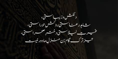 You are charming and beautiful; you are a graceful beloved. You rival the Houri (of Paradise); you are the envy of Laila. You are the daughter of the desert! Step more swiftly, for our destination is not far.