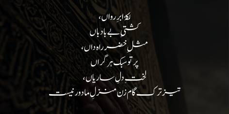 You are a patch of moving cloud; you are a ship without sails. Like Khizr, you know the way; every heavy burden is light to you. You are the piece of the driver’s heart! Step more swiftly, for our destination is not far.