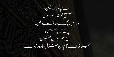Your evening is in Yemen; your morning is in Qaran. In this coarse sand of the homeland, your feet find jasmine. O you who are like the gazelle of Khutan! Step more swiftly, for our destination is not far.