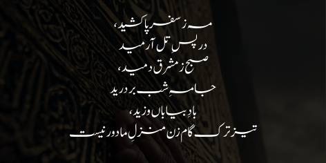 My melody is heart-opening; its rise and fall are soul-invigorating. It is the bell for the caravans; it disperses old turmoils and creates new ones. O you who rub your face on the dust of the Haram! Step more swiftly, for our destination is not far.
