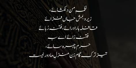 Iqbal kehte hain ke teri lagam mein wo tarap (soz) hai jo tujhe rukne nahi deti aur teri chaal mein wo naghmagi (saaz) hai jo dekhne wale ko mashoor kar deti hai. Tu bhook aur pyas ki parwa kiye baghair din raat safar mein rehti hai. Tere liye aaram aur qiyam hi asl thakan hai, kyunke teri fitrat mein sirf chalna aur aagay barhna likha hai. Pas ay himmat ki paikar! Zara aur teez chal ke manzil ab door nahi.