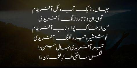 Tu ne raat banayi, main ne (usay roshan karne ke liye) chiragh banaya. Tu ne mitti paida ki, main ne us se piyala bana liya. Tu ne sehra, pahar aur jangal takhleeq kiye, main ne un mein phulwari, gulzar aur bagh lagaye. Main wo hoon jo pathar se aaina bana leta hoon aur main wo hoon jo zahar se taryaq (meetha mashroob) tayyar kar leta hoon.