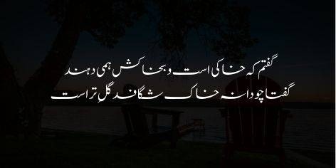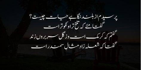 Mein ne aik buland nigah (arif) se poocha ke zindagi kya hai? Us ne kaha ke yeh woh sharab hai jo jitni kadwi ho utni hi achi hai. Mein ne kaha ke yeh to aik mamooli keeda hai jo mitti se sar nikalta hai, us ne jawab diya ke nahi, balki yeh samandar (aag ke keeday) ki tarah sholay se paida hui hai.