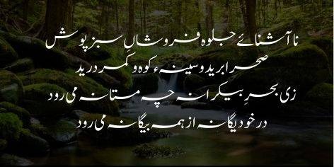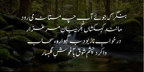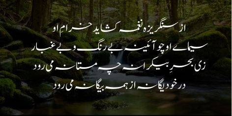 Is ki chaal sang-rezon se naghme paida karti hai, is ki peshani aaine ki tarah saaf aur gard o ghubar se paak hai. Yeh be-kinar samandar ki taraf kaisi mastana chali ja rahi hai; apne aap mein kaamil (be-misl) aur duniya ki baqi cheezon se be-niyaz ho kar rawan hai.